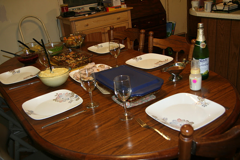 Tonight we celebrated our family Thanksgiving. The table was of course full of all the trimmings ... yummy turkey, stuffing, mashed potatoes, swiss casserole, peas, corn, cranberry sauce, and croissants.
